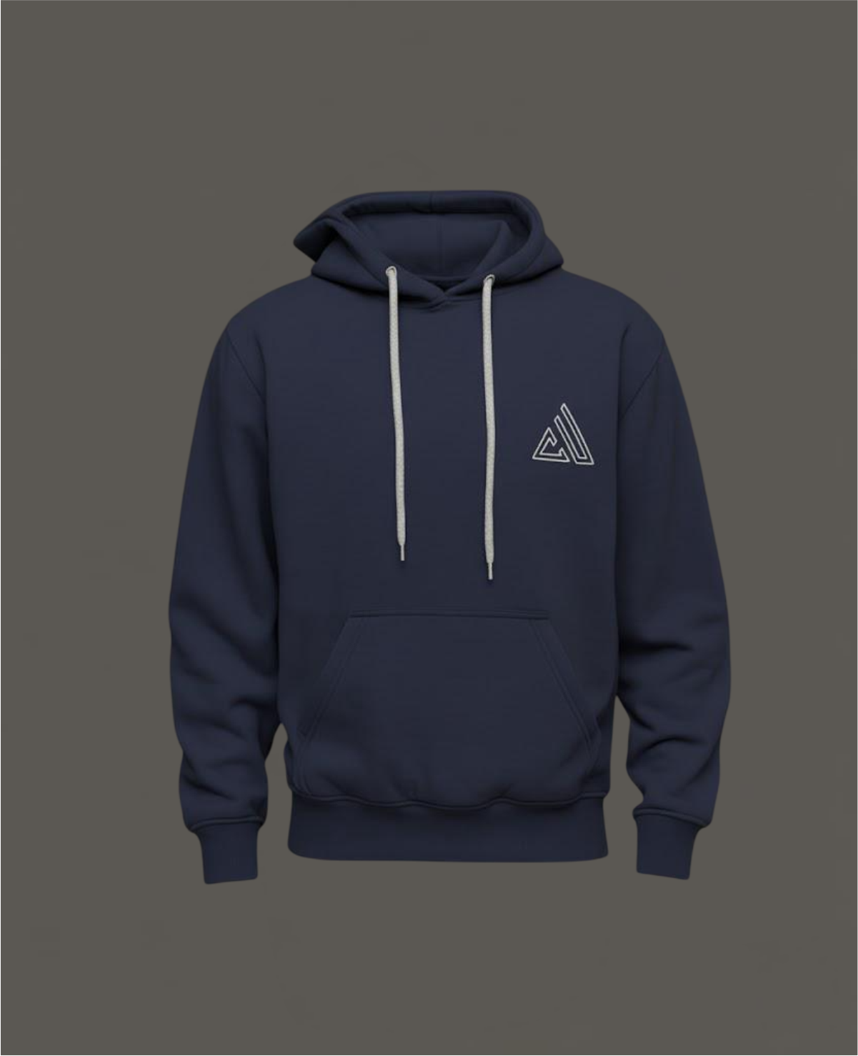 Hood: Features a standard hood with a visible seam structure and thick, contrast or matching drawstrings for adjustment (white drawstrings are prominent on both the light grey and navy blue versions).